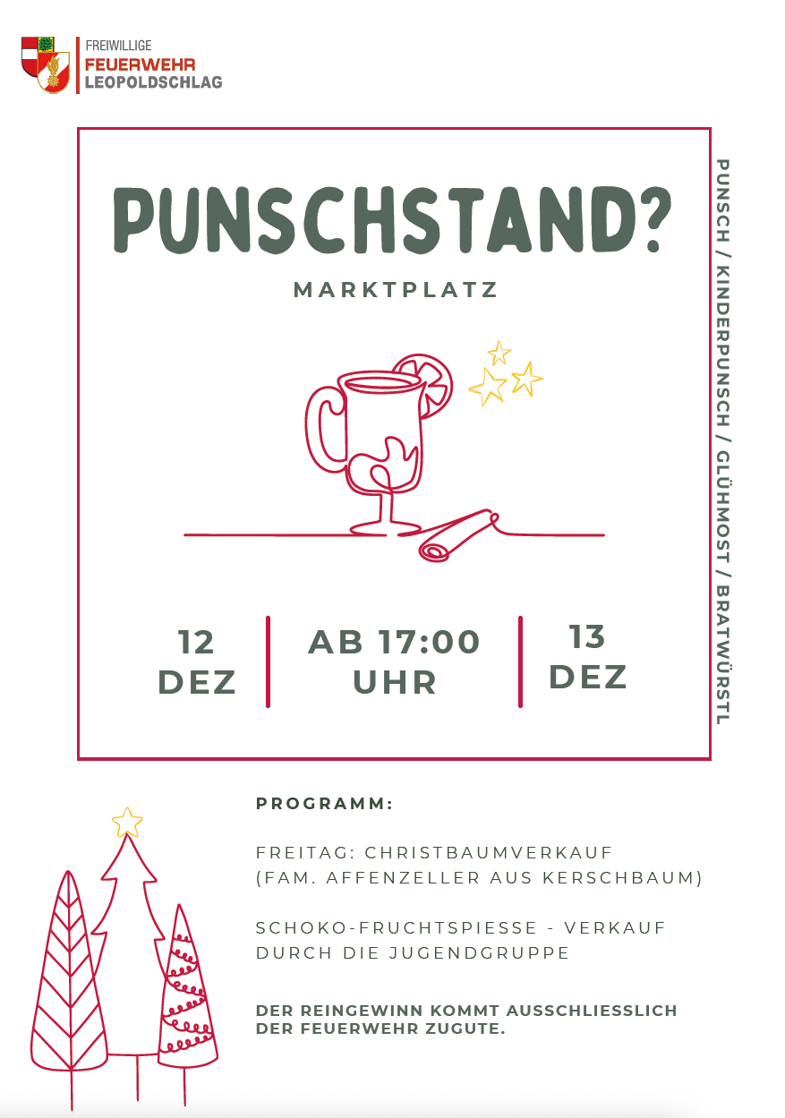 Am 12. und 13. Dezember findet wieder unser Punschstand am Marktplatz statt. Wir freuen uns auf euer kommen. Das Programm findet ihr im Bild.