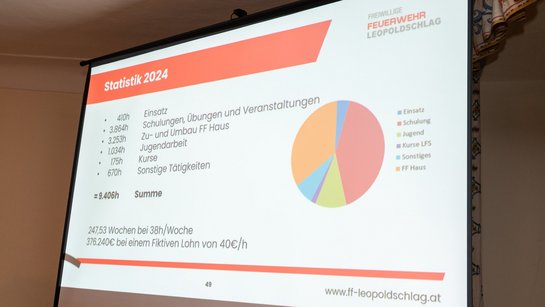 Ca. 9400 Stunden war die FF Leopoldschlag im vergangen Jahr für die Gemeinde im Einsatz, wobei die meisten Stunden auf den Übungs- und Ausbildungsdienst und auf den Feuerwehrhausbau fallen (Jahresrückblick 2024).